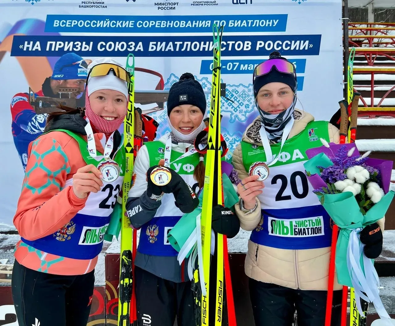 Анне Коряковой, Олесе Барышевой и Анжелике Васильевой за победные финиши на Первенствах России по лыжным гонкам и легкой атлетике.