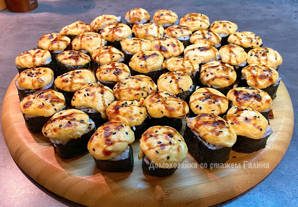 - По завершении процесса запекания, роллы поливаются соусом унаги.