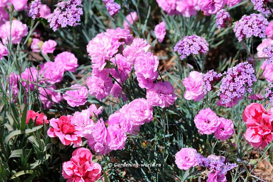 Вербена порадует цветением к июлю и продлится до середины осени. Разнообразие цветов, таких как белый, красный и фиолетовый, добавят яркости клумбе. Однако будьте готовы к том, что семена имеют низкую всхожесть и нуждаются в стратификации. Укладывайте семена между двумя влажными ватными дисками и поместите в холодильник на несколько дней, прежде чем сажать в рыхлый субстрат. Пикируйте ростки при появлении настоящих листиков, высаживая растения в конце мая.