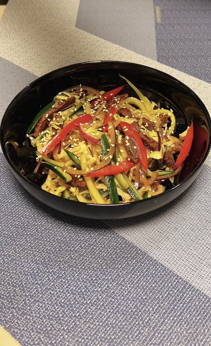 Тайский салат с говядиной — это идеально сбалансированное блюдо, где шедеврально сочетаются разнообразные текстуры и вкусы. Нежная говядина, хрустящий айсберг и яркий болгарский перец дополняются легкой пикантностью соуса.