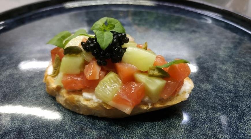 Подготовка багета: Нарезать багет по диагонали и немного подсушить до хрустящей корочки. Это можно сделать в духовке, на гриле или в тостере.Подготовка овощей: Огурцы тщательно вымыть, очистить от кожуры и семян, а затем нарезать кубиками. Каперсы нарезать пополам вдоль.Приготовление начинки: Лососевое филе снять с кожи и нарезать кубиками. Смешать его с огурцами, добавить лимонный сок и аккуратно перемешать массу.Сборка брускетты: На подсушенные ломтики багета намазать крем-чиз. Затем выложить начинку из лосося с огурцами и сверху разместить икру палтуса. Для украшения использовать листья базилика и нарезанные каперсы.Этот рецепт брускетты сочетает в себе изысканные ингредиенты, которые радикально преобразят ваш стол и покорят сердца гостей. Приятного аппетита!