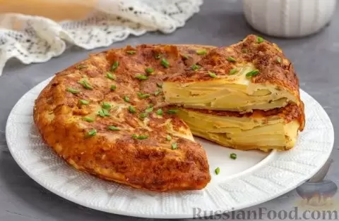 - Омлет с картофелем и луком. Это блюдо похоже на запеканку, но готовится прямо на сковороде. Тонкие колечки картофеля обжариваются с луком, а затем заливаются омлетной смесью из яиц, создавая аппетитный завтрак.