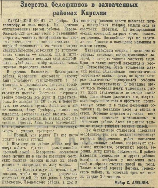 О зверствах белофиннов в захваченных районах Карелии писала газета "Красная Звезда" в 1943 г. (на скриншоте).
