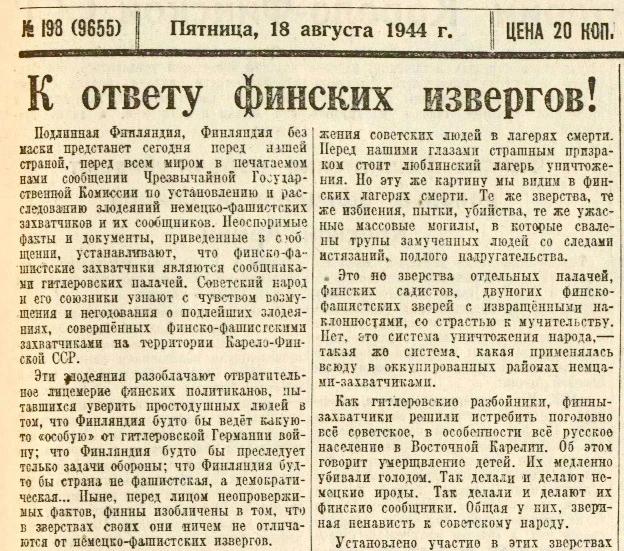 Ныне, перед лицом неопровержимых фактов, финны изобличены в том, что в зверствах своих они ничем не отличаются от немецко-фашистских извергов...