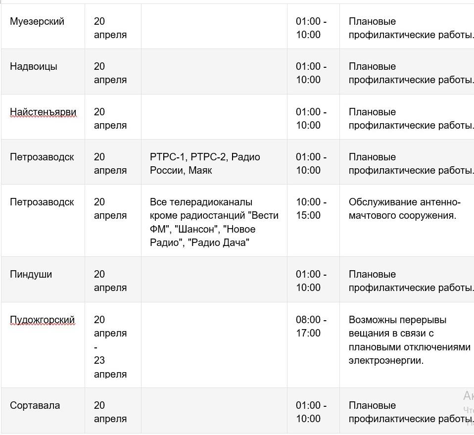 Радиотелевизионный передающий центр Карелии предупреждает о кратковременных перерывах вещания на объектах телерадиосети 20-23 апреля. Временные отключения коснутся цифровых пакетов программ РТРС-1 и РТРС-2.