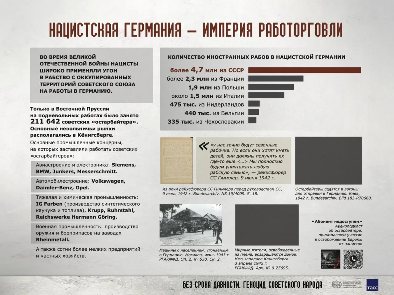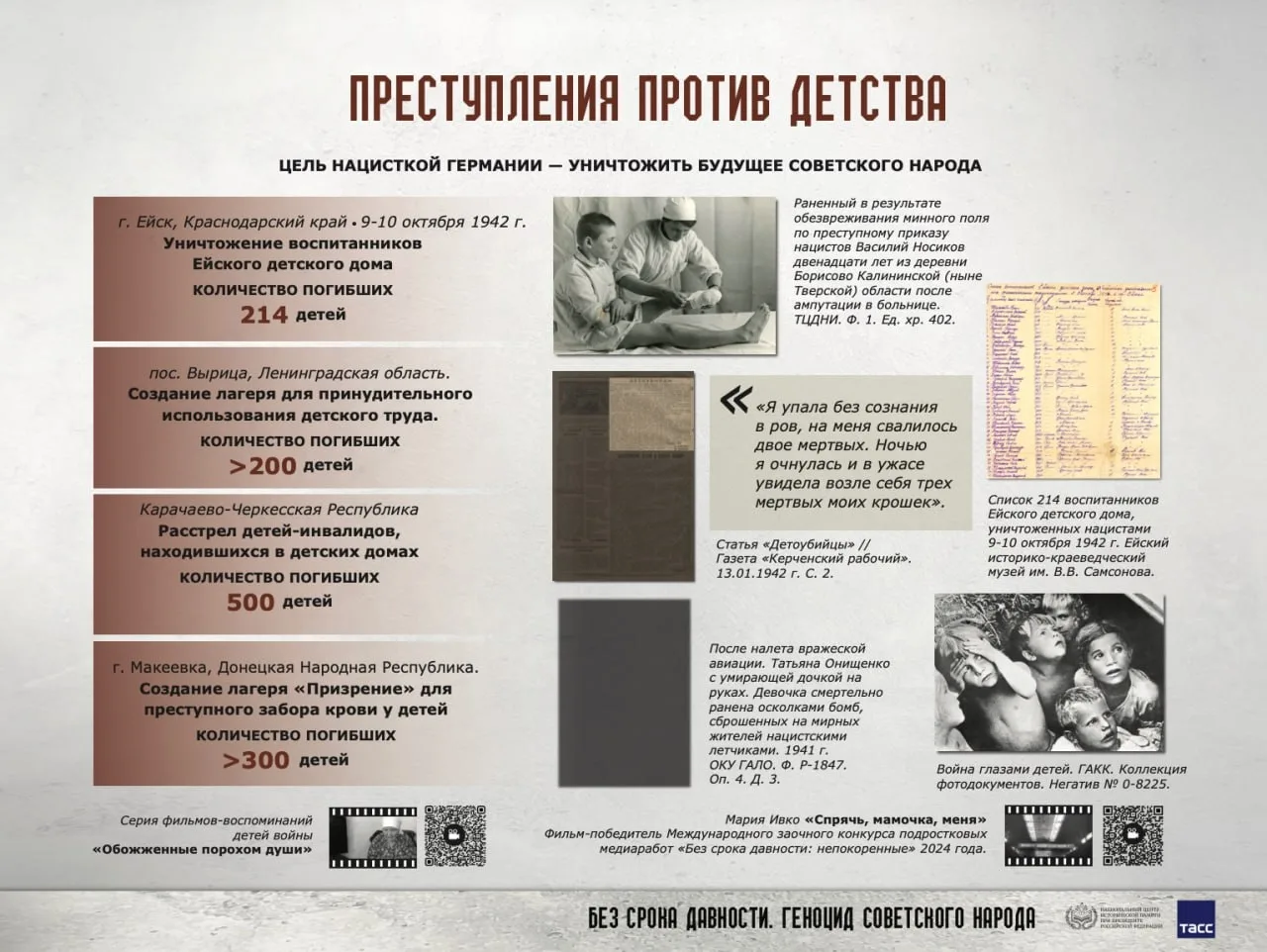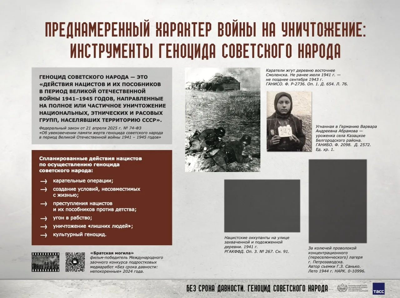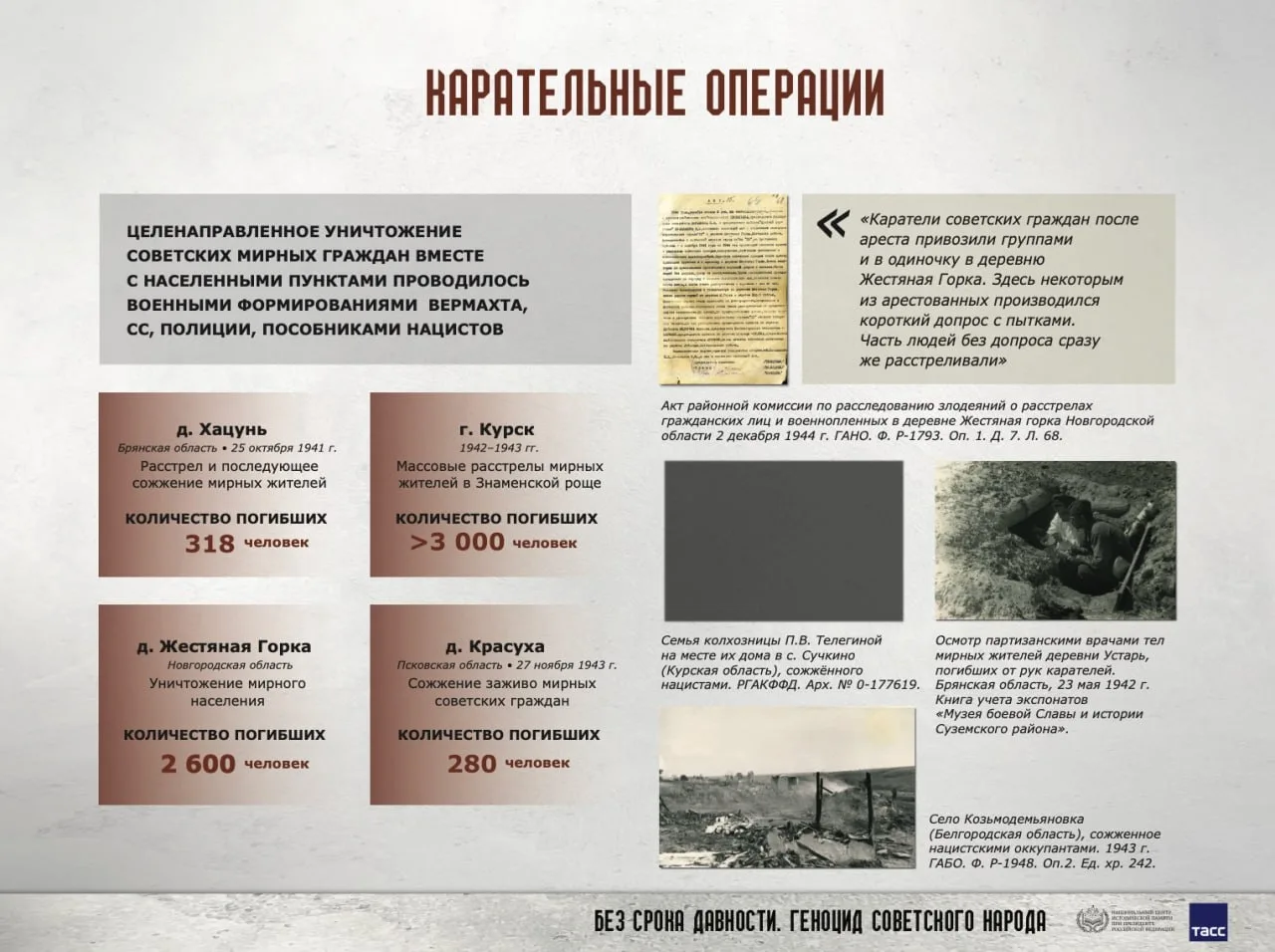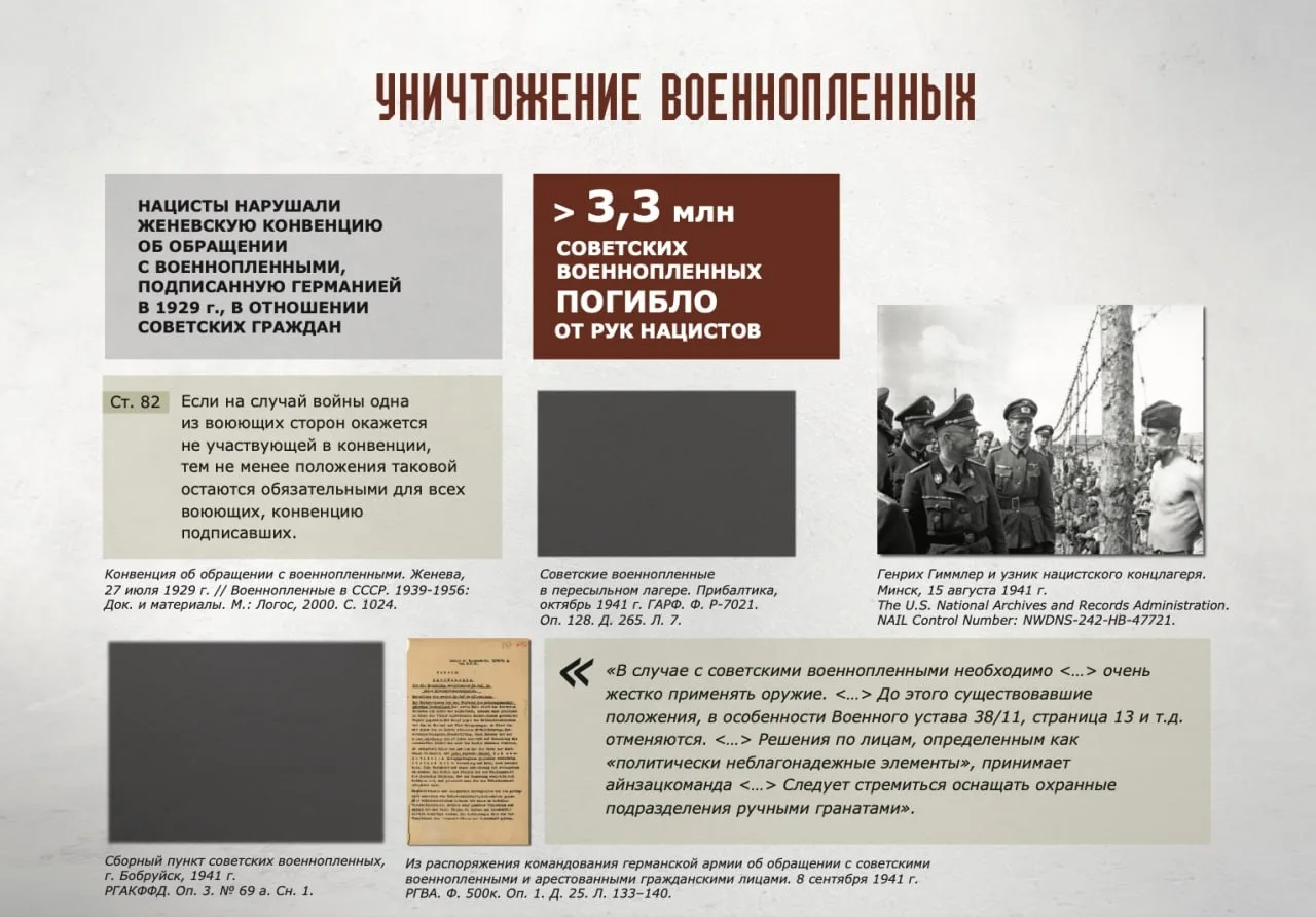 Национальным центром исторической памяти (НЦИП) при Президенте Российской Федерации подготовлена онлайн-выставка «Без срока давности. Геноцид советского народа», в которой представлены представлены документальные свидетельства и материалы, раскрывающие различные аспекты политики проводимого нацистами геноцида карательные операции, массовое уничтожение мирных жителей, создание условий, несовместимых с жизнью, преступления, совершённые против детей, женщин и стариков.