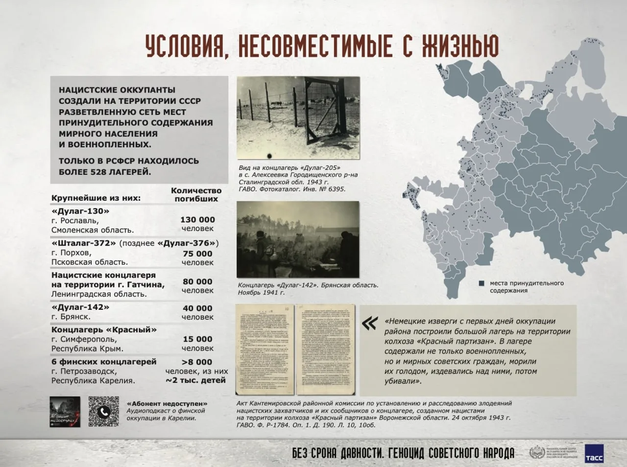 На территории Советского Союза немецко-фашистскими захватчиками была создана, как и в Европе, сеть концлагерей и мест принудительного содержания мирного населения и военнопленных Красной армии (только на территории одной РСФСР находилось более 528 лагерей), где погибли десятки тысяч человек. Крупнейшими нацистскими концлагерями на территории Советского Союза были «Дулаг-130», «Шталаг-372» (позднее «Дулаг-376»), «Дулаг-142» или #БрянскийБухенвальд, концлагерь «Красный», финские концлагеря в Карелии и др. «фабрики смерти».
