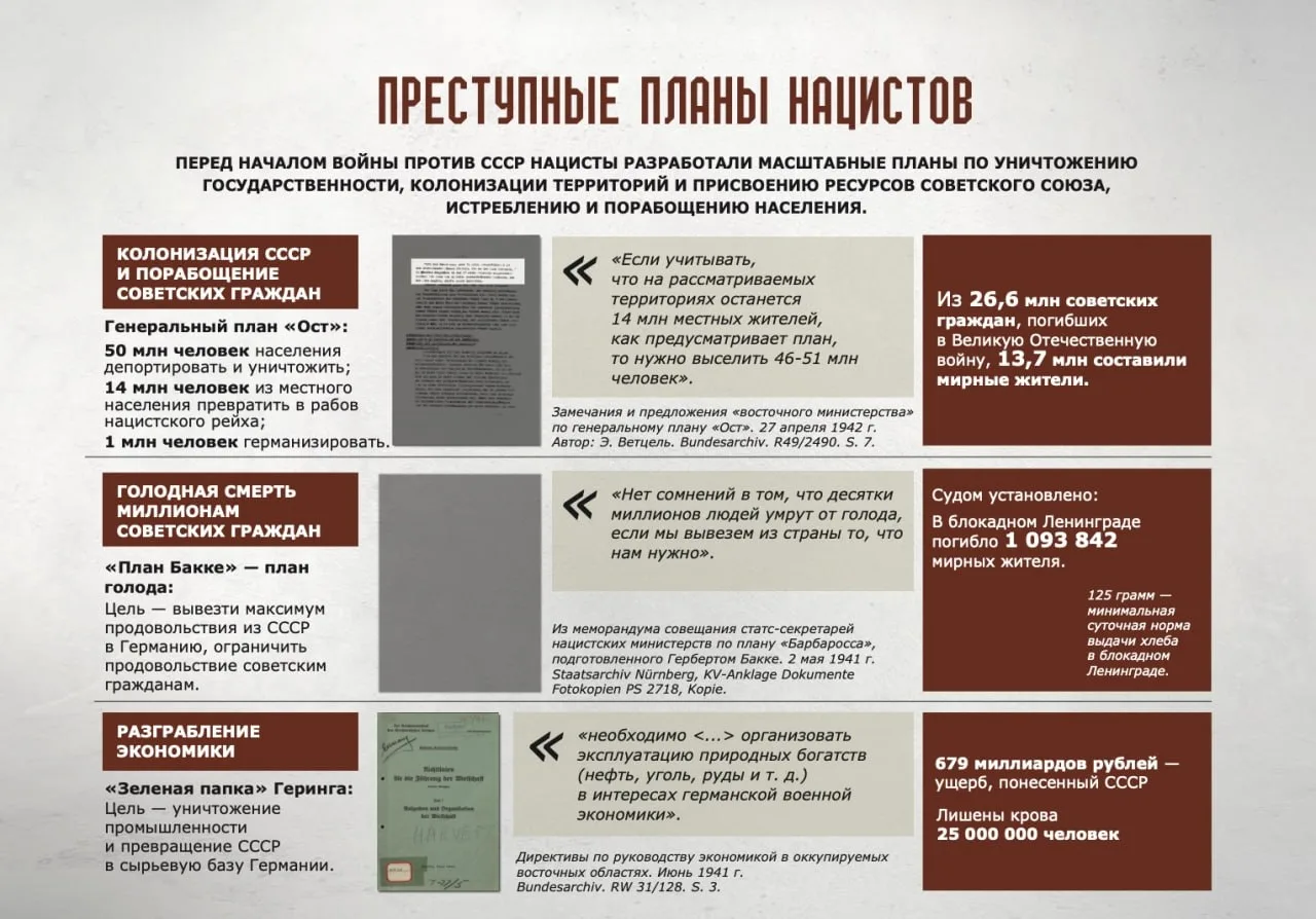 Нацистскому руководству был представлен Генеральный план «Ост», согласно которому 50 миллионов человек — граждан СССР, подлежали депортации и уничтожению; 14 миллионов — порабощению в нацистской неволе, а 1 млн — беспощадной германизации. Немцы стремились удушить наш народ голодом: согласно т.н. Плану Бакке, предполагалось вывезти максимум продовольствия из СССР в Германию и ограничить питание советских граждан.