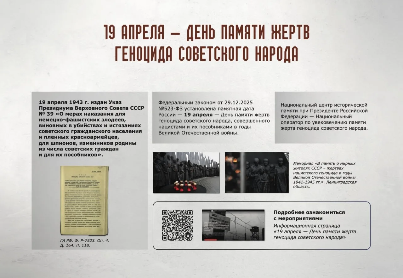Эта знаковая дата была установлена в соответствии с подписанным Президентом России В.В.Путиным 29 декабря 2025 года Федеральным законом №523-ФЗ, а основные параметры увековечения памяти жертв геноцида определены №74-ФЗ. Выбор даты 19 апреля не случаен — именно #вЭтотДень в 1943 году вышел Указ Президиума Верховного Совета СССР № 39, в котором впервые была дана правовая оценка целенаправленной и масштабной политики нацистов и их пособников по уничтожению мирного населения нашей страны.